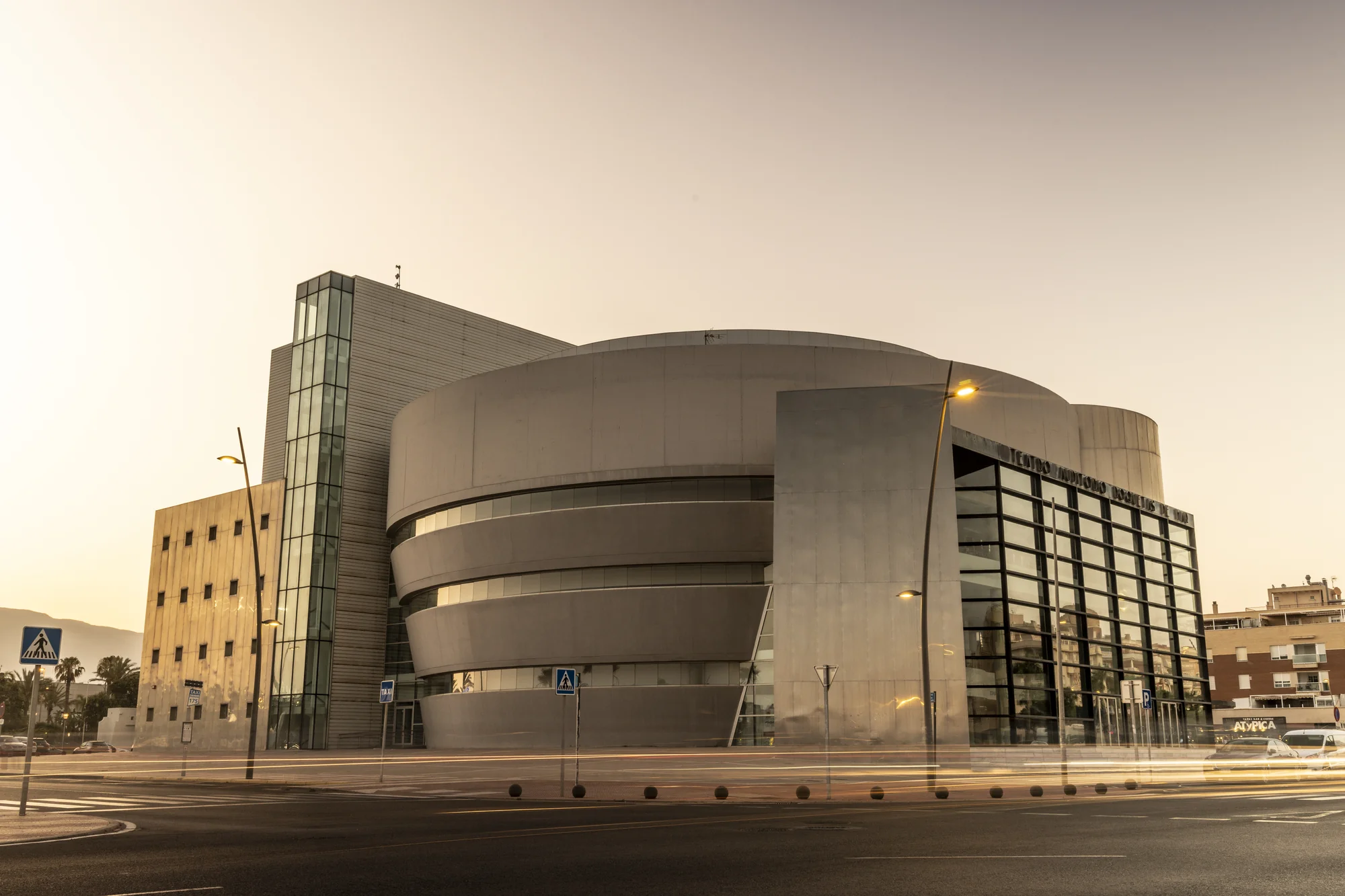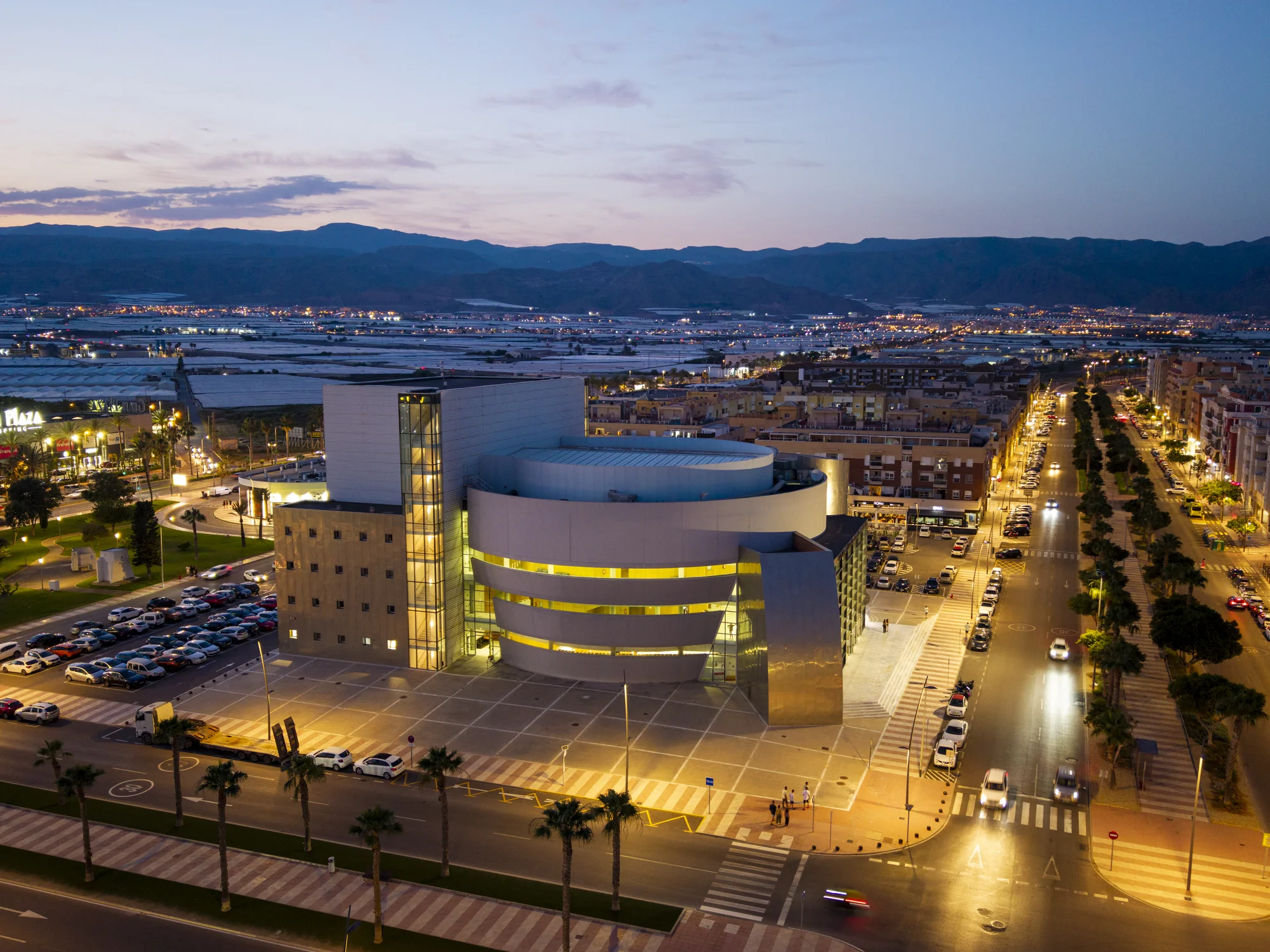 Este moderno complejo fue diseñado por el arquitecto Miguel A. Morales con la visión de albergar una amplai gama de espectáculos y eventos, dotando a Roquetas de Mar de una infraestructura cultural de primer nivel. Su arquitectura vanguardista fusiona funcionalidad y estética, recordando en sus formar al Museo Guggenheim de Bilbao y diseñada para ofrecer la mejor experiencia posible. Su moderna estructura de forma redonda ha sido capaz de equilibra el volumen y la transparencia, dotando de luz al interior a través de las grandes cristaleras en varias alturas que conforman su entrada principal.
